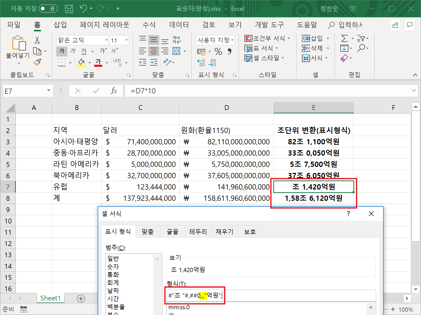 안녕하세요. 오늘은 엑셀의 숫자 서식을 한글의 조 단위 억 단위 만단 위로 끊어 표기하는 방법에 대해서 알아보겠습니다.