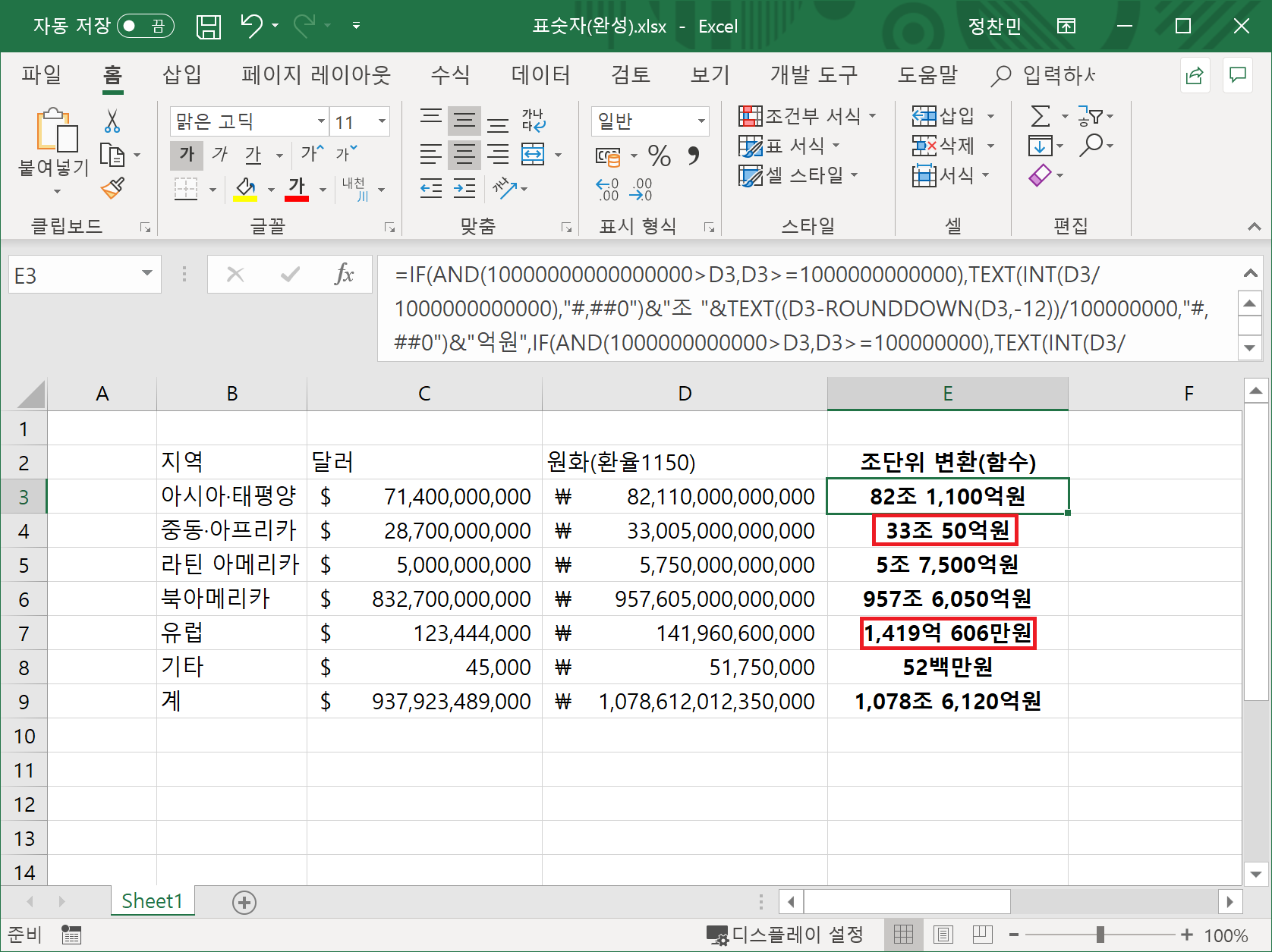 =IF(AND(10000000000000000>D3,D3>=1000000000000),TEXT(INT(D3/1000000000000),"#,##0")&"조 "&TEXT((D3-ROUNDDOWN(D3,-12))/100000000,"#,##0")&"억원",IF(AND(1000000000000>D3,D3>=100000000),TEXT(INT(D3/100000000),"#,##0")&"억 "&TEXT((D3-ROUNDDOWN(D3,-8))/100000,"#,##0")&"만원",TEXT(D3,"#,##0,,백만원")))