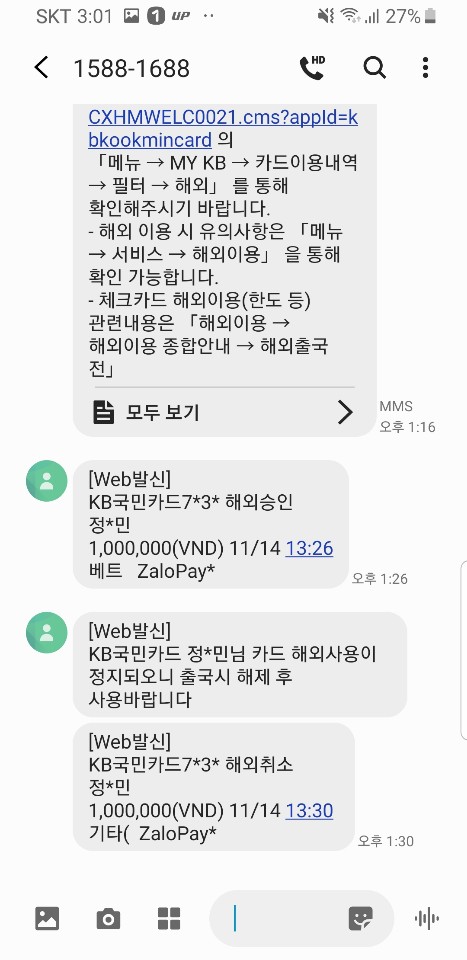 그리고 전화통화 도중에 또 결제가 되었네요;;; -_-;; 베트남에서 결제가 되었다가 취소가 되어버렸네요.