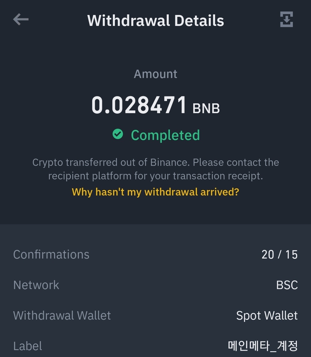 2만원치를 보내는 이유는, 바이낸스에서 BNB코인의 최소 출금 금액이 약 1.6~7천원이 되기 때문입니다.