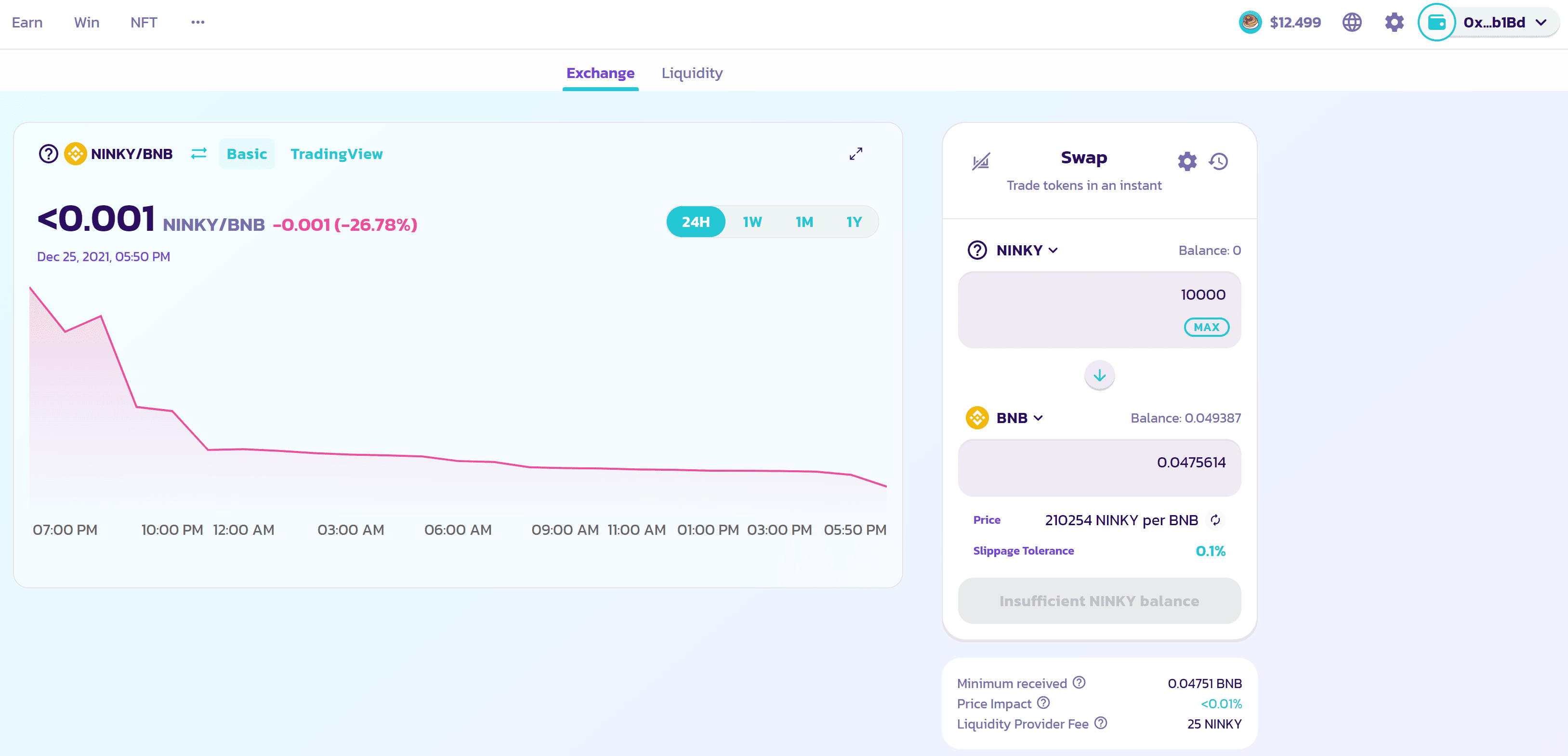 이제 팬케이크스왑 (https://www.pancakeswap.finance/swap)에 접속해서 닌키 코인을 BNB코인으로