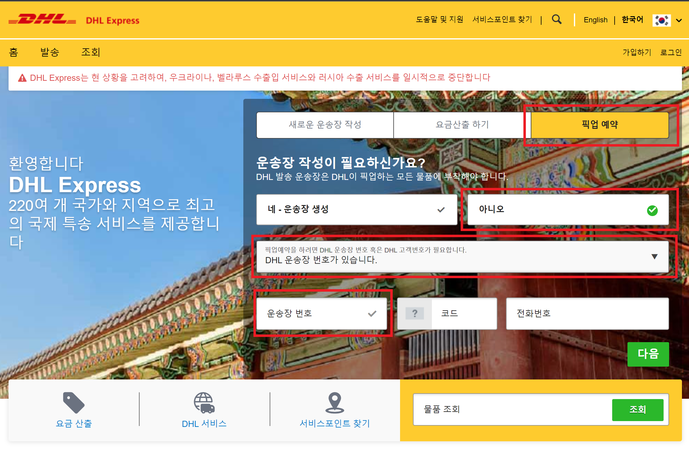 DHL 익스프레스 픽업 예약, 발송, 요금 조회, 배송 조회하기