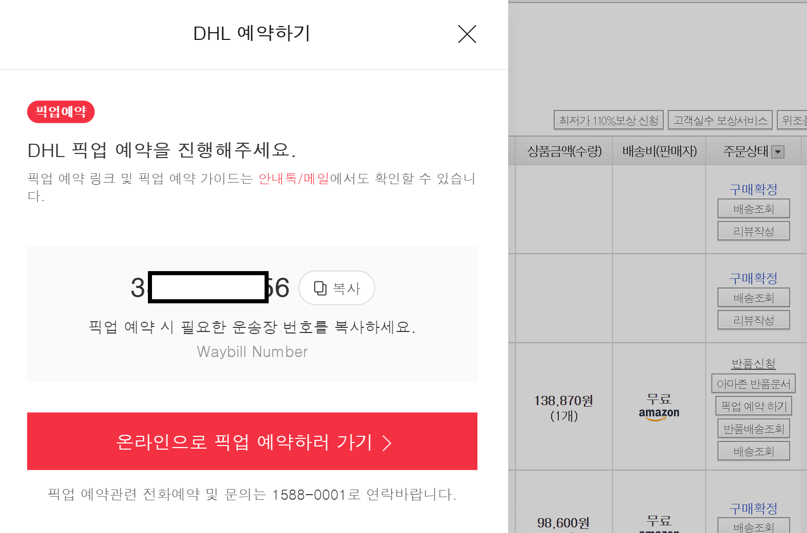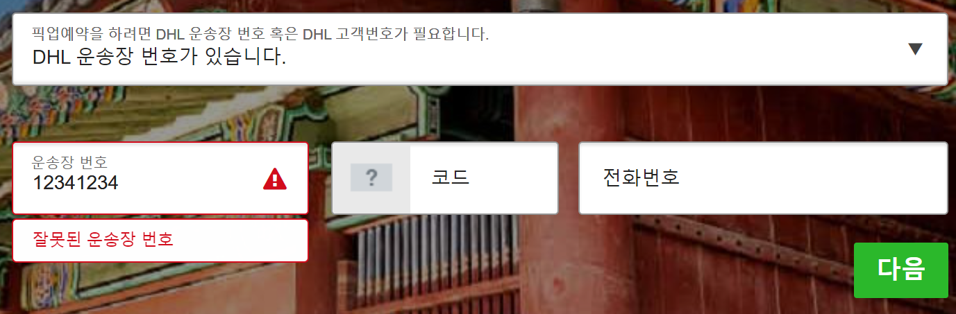 이 Waybill Number 번호를 복사해서 DHL 픽업 예약 사이트에 메인에 기입해주면 다음으로 넘어갑니다.