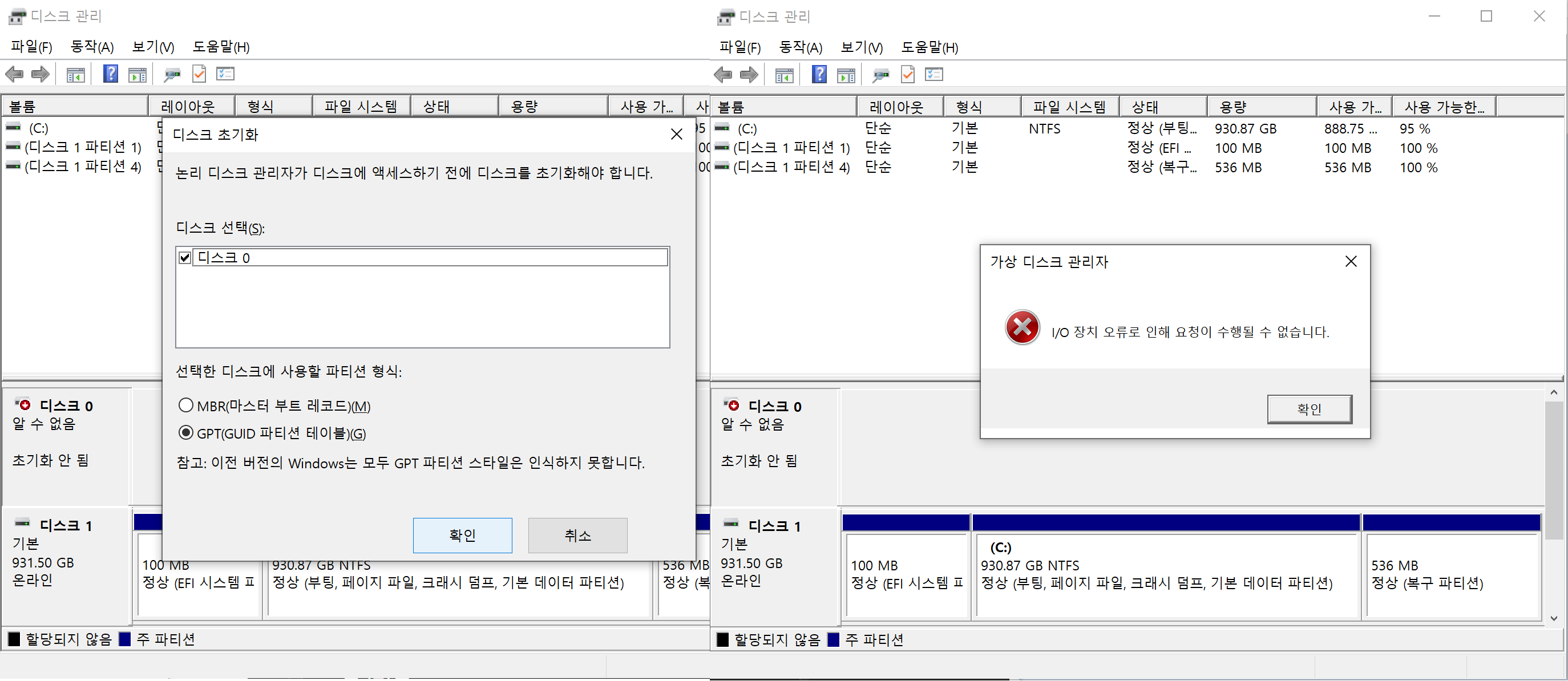 디스크 관리로 가서 초기화를 해보려고 하니, "I/O 장치 오류로 인해 요청이 수행될 수 없습니다."라고 뜹니다.