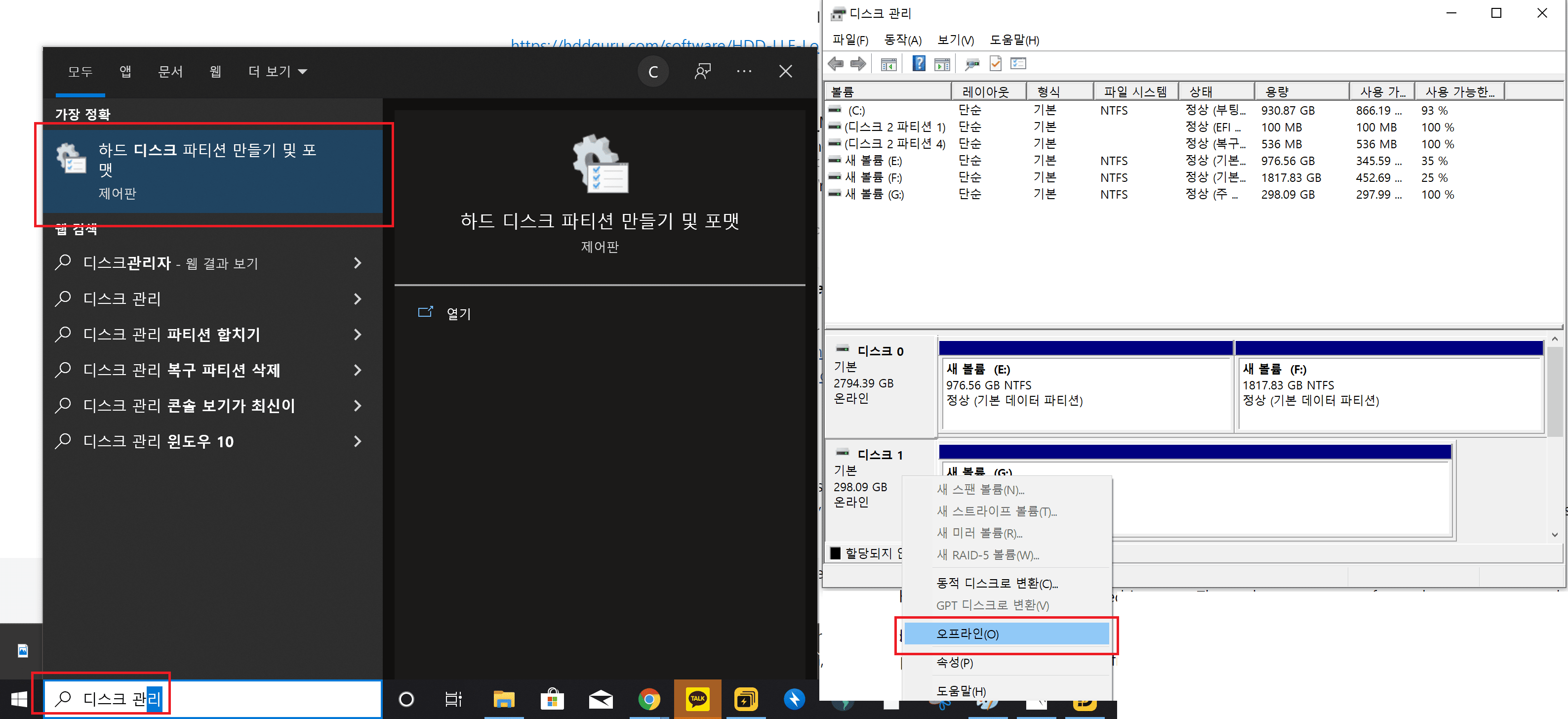 검색창에서 '디스크 관리' 입력 후 해당 HDD의 상태를 볼륨 삭제(파티션 삭제)를 해줍니다.