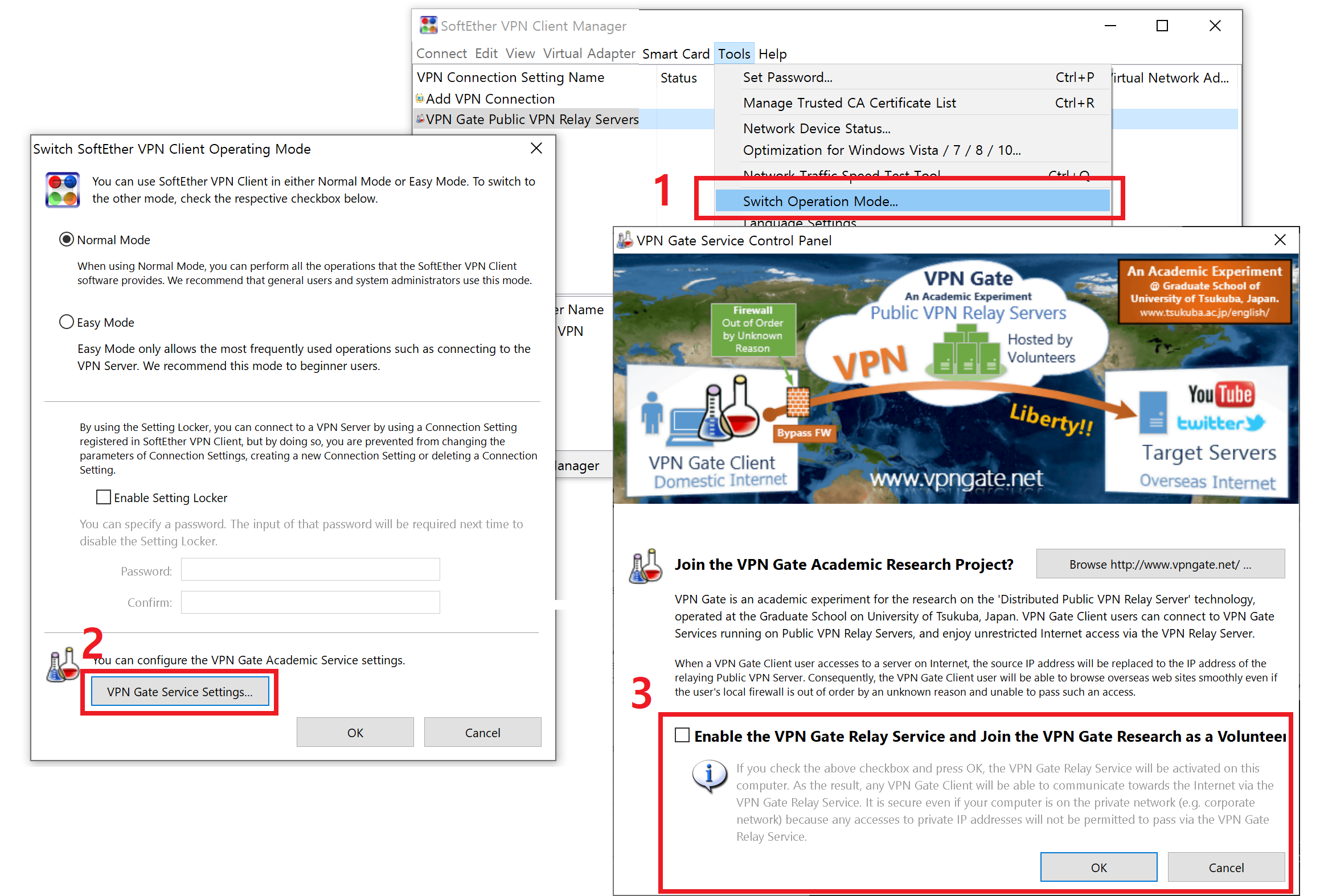 해당 프로그램에서 VPN Gate 플러그인은, 쓰쿠바대학과 SoftEhter 측에서 제공하는 무료 VPN 서비스로, 전 세계의 자원봉자사(Volunteer)의 자발적인 인터넷 회선 제공으로 서비스가 이루어지게 됩니다.