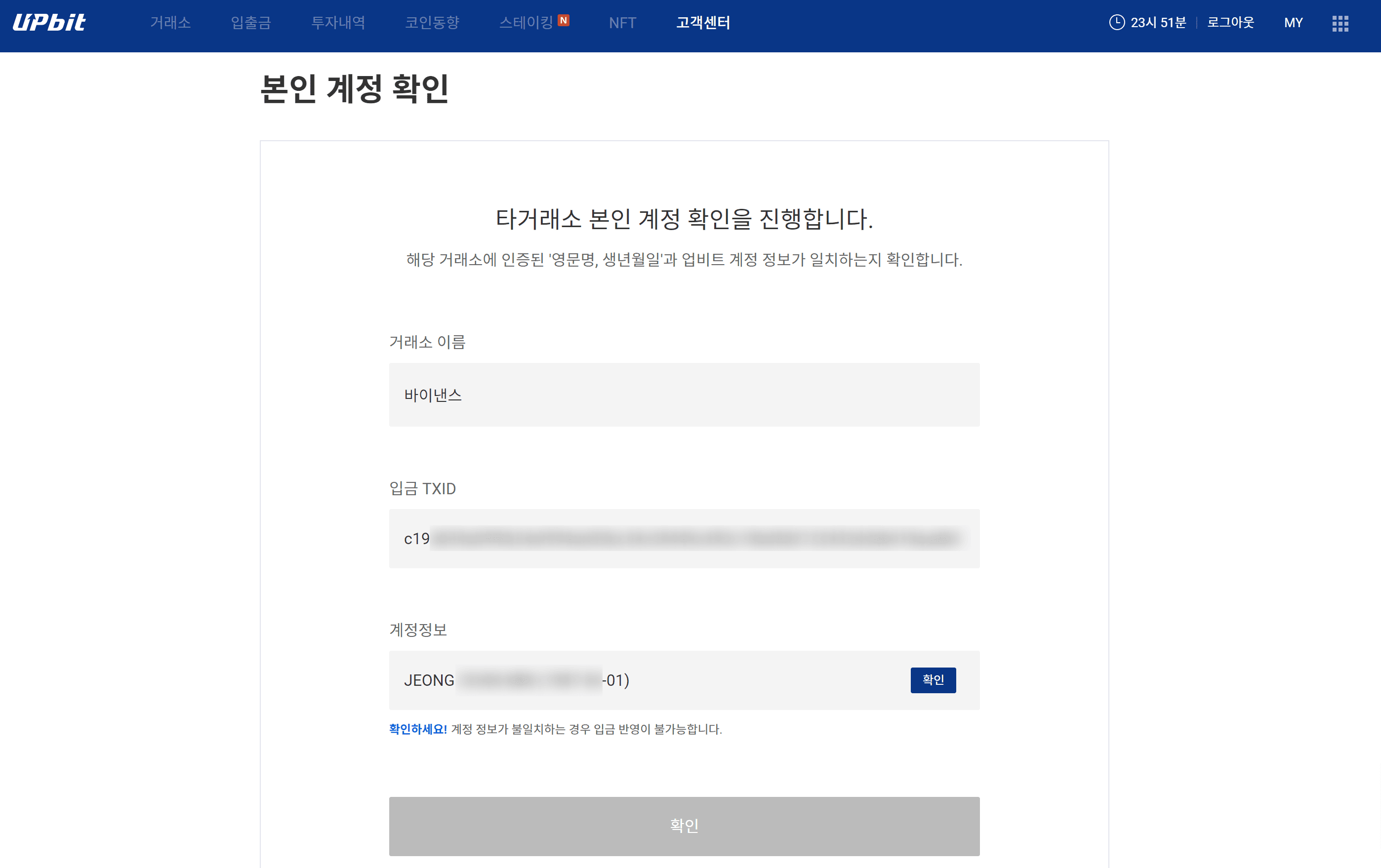 업비트와 바이낸스 간의 입금 출금 전송을 하기 위해서는 반드시 두 정보가 일치하는지 확인을 해야 합니다.