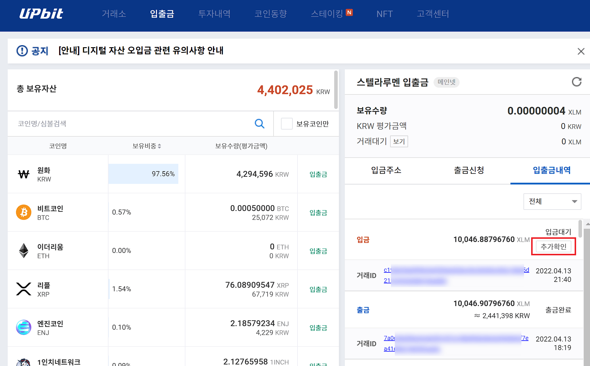 2022-04-13 18:19 업비트 출금 버튼 클릭 후 출금 대기 상태