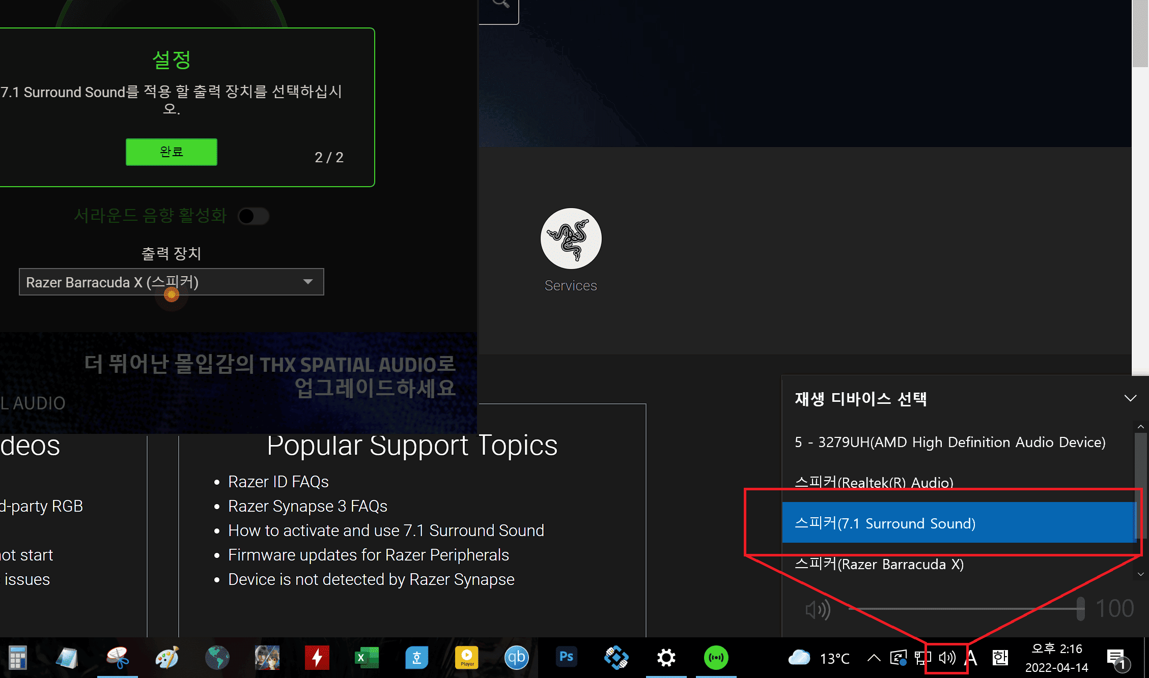 설정에 들어가서 7.1 서라운드 사운드 소프트웨어 자동실행을 끄더라도, 바라쿠다 X를 착용 후