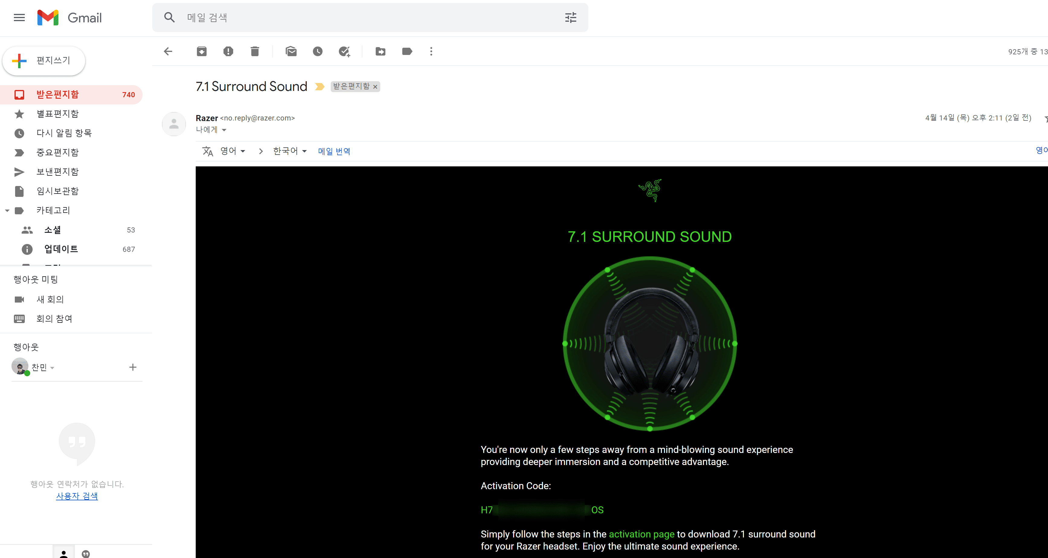 등록이 완료되자마자, 이메일로 RAZER 7.1 Surround Sound System