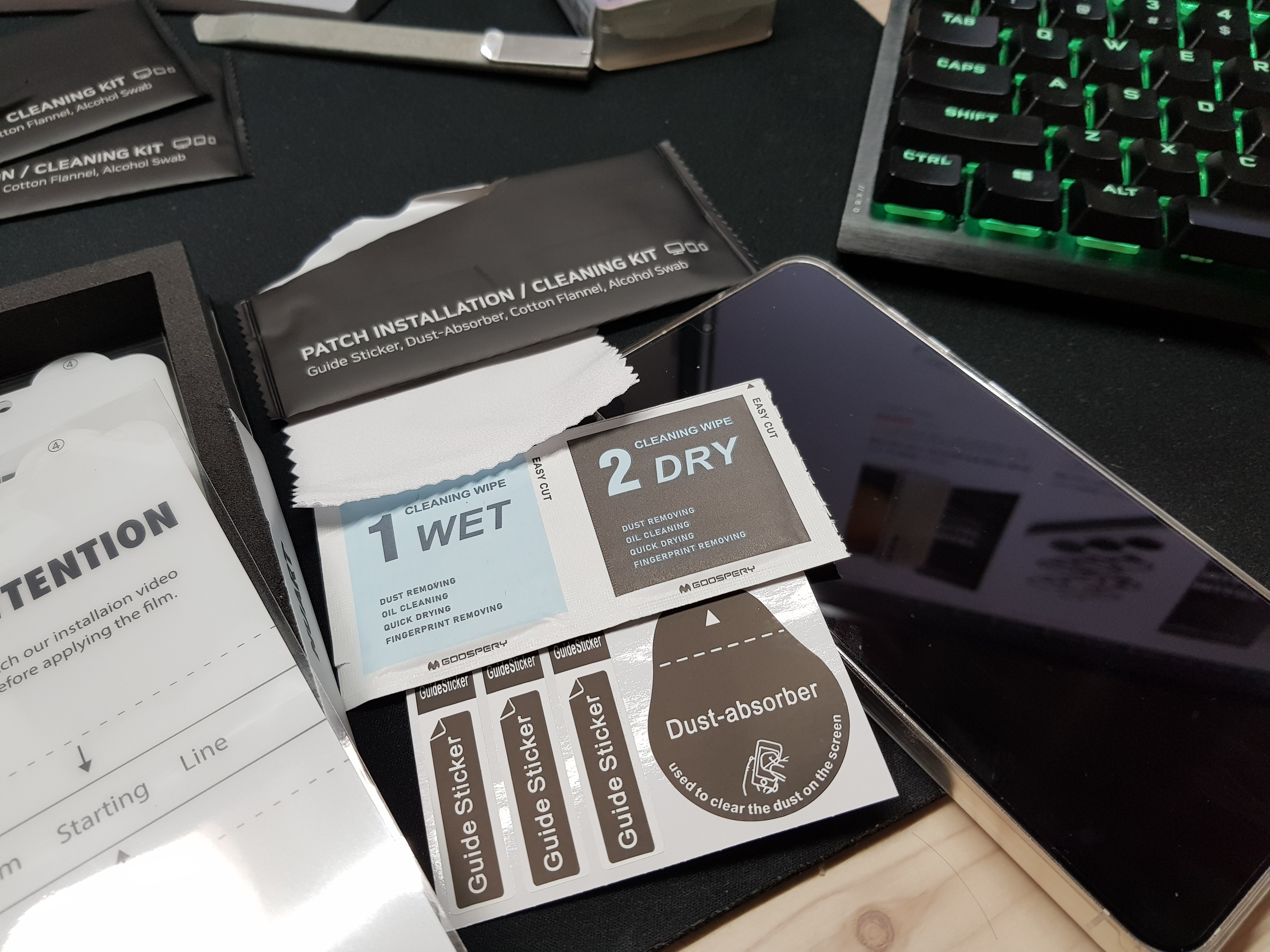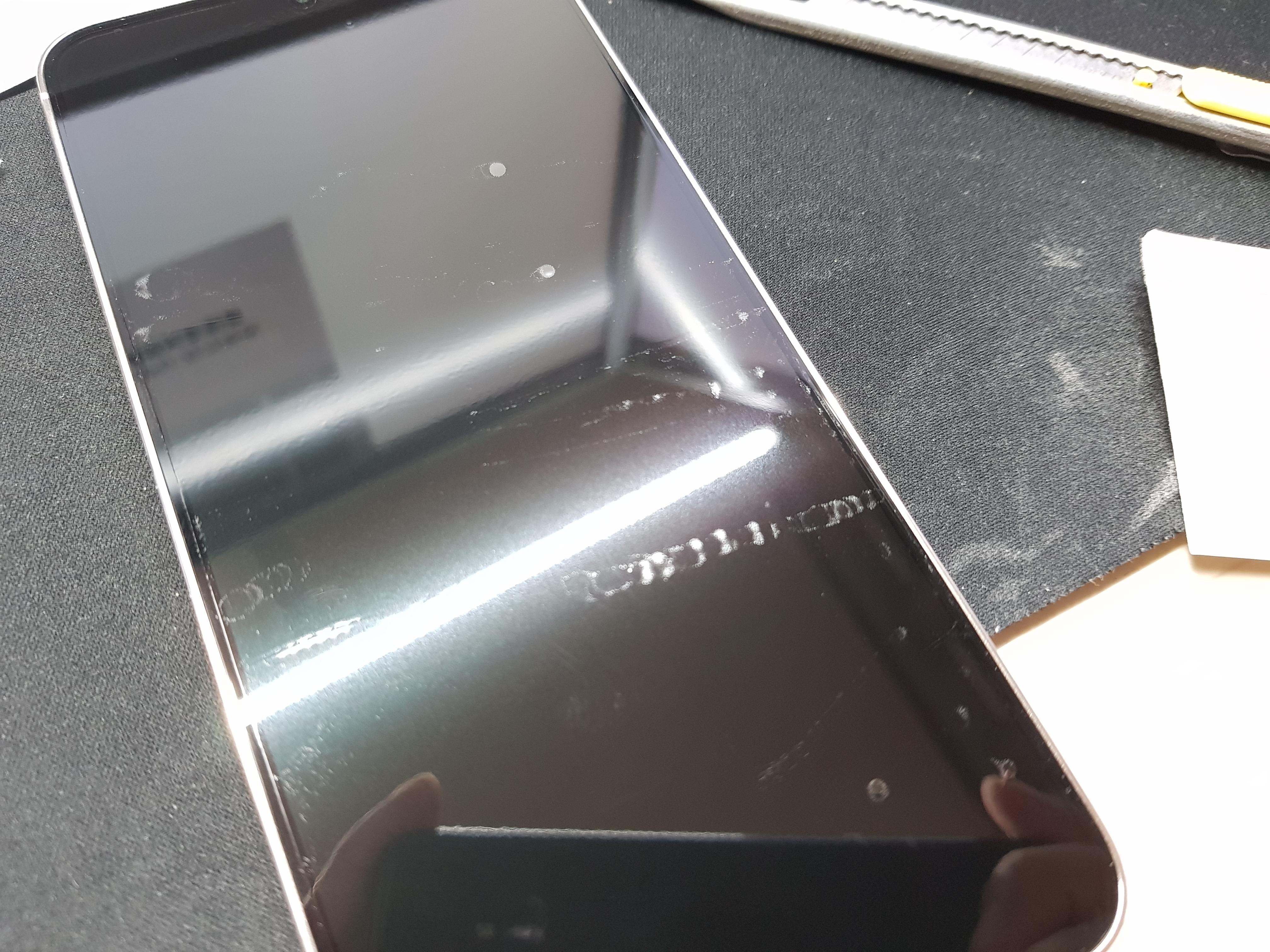 첫 번째 부착.. 바로 실패했습니다.. 안에 기포도 많이 남고, 기포가 밀리면서 자국이 너무 심하게 생겼어요.