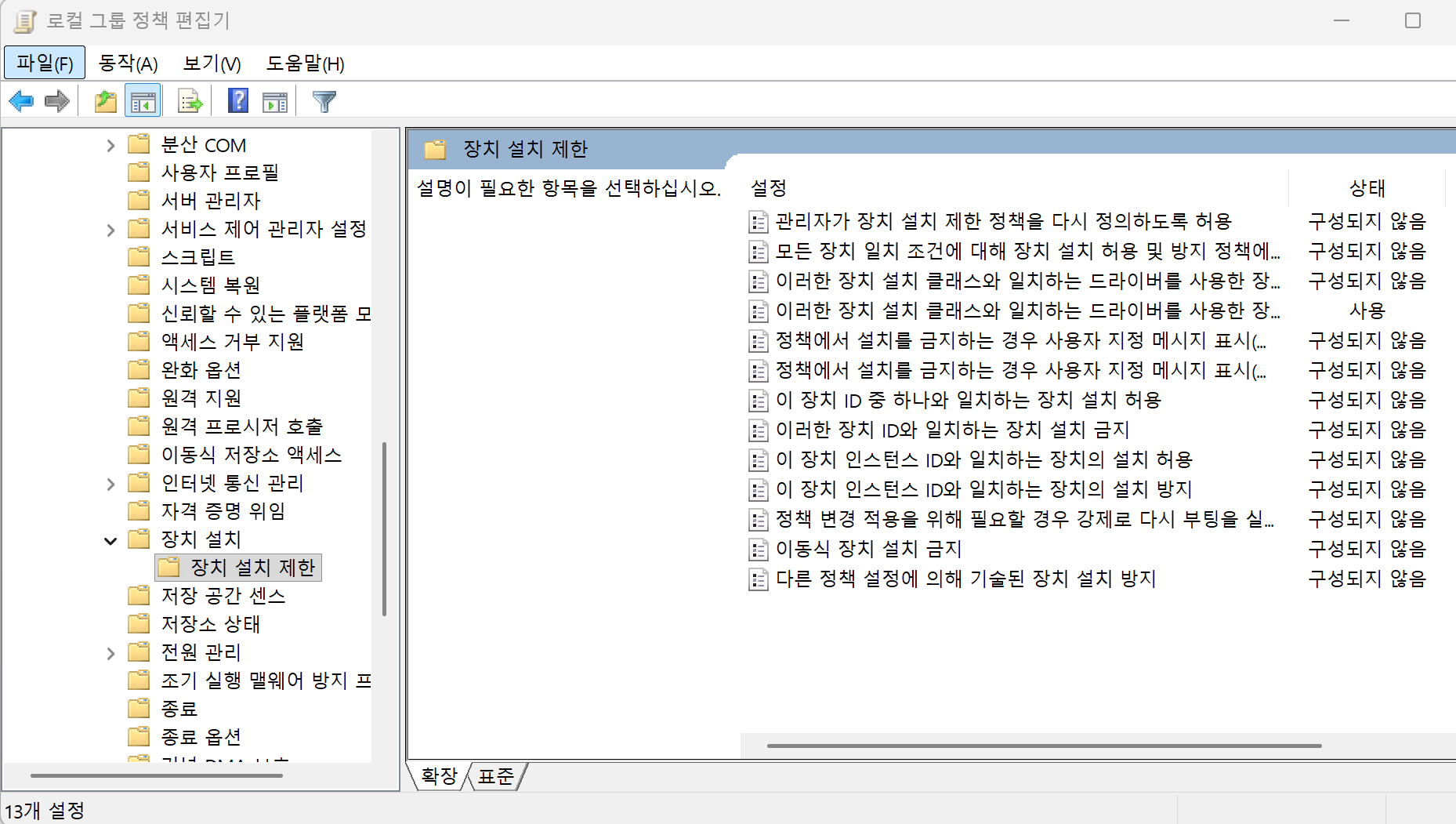 컴퓨터 구성 → 관리 템플릿 → 시스템 → 장치 설치 → 장치 설치 제한
