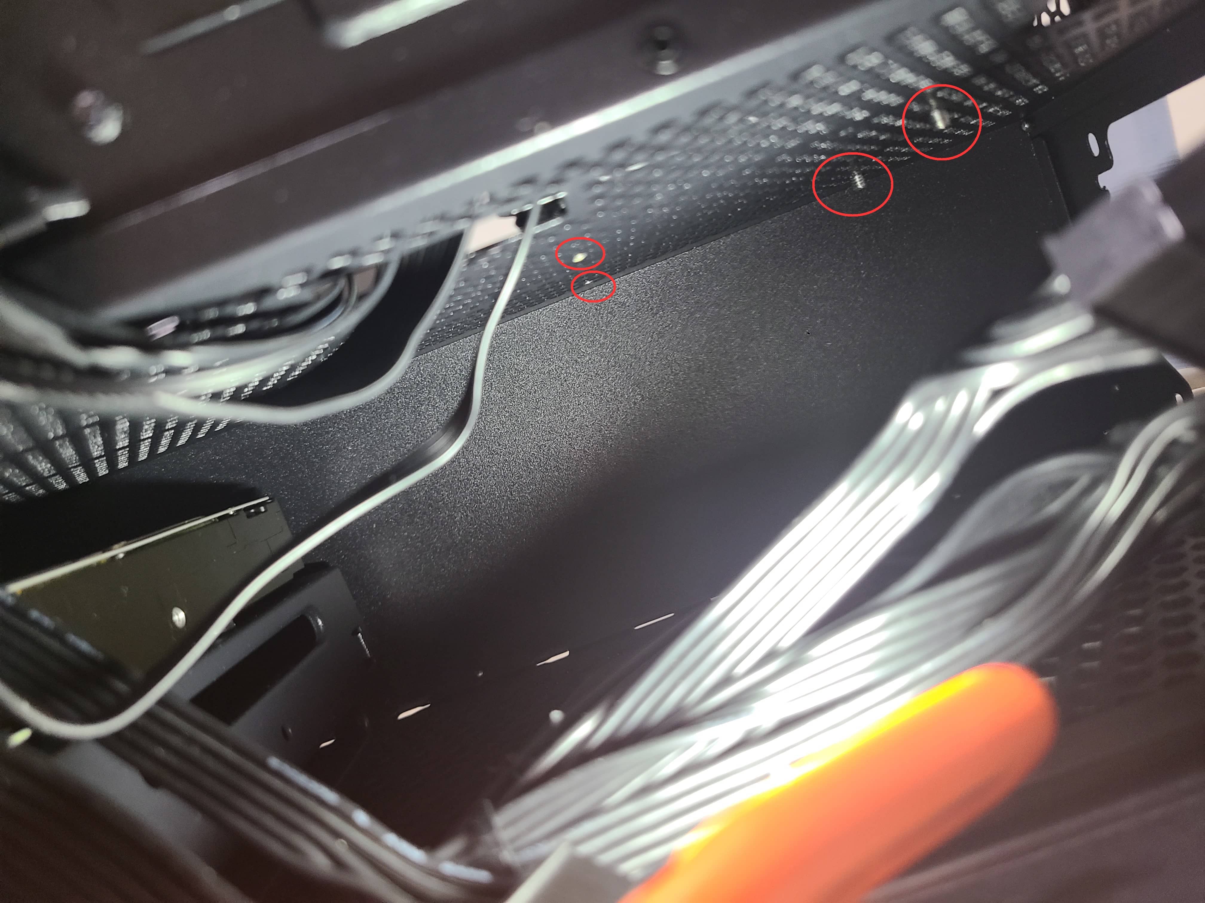 HDD와 브라켓을 파워 장착 부분 위쪽 메쉬 구멍에 맞게 자리를 위치시키면 됩니다.
