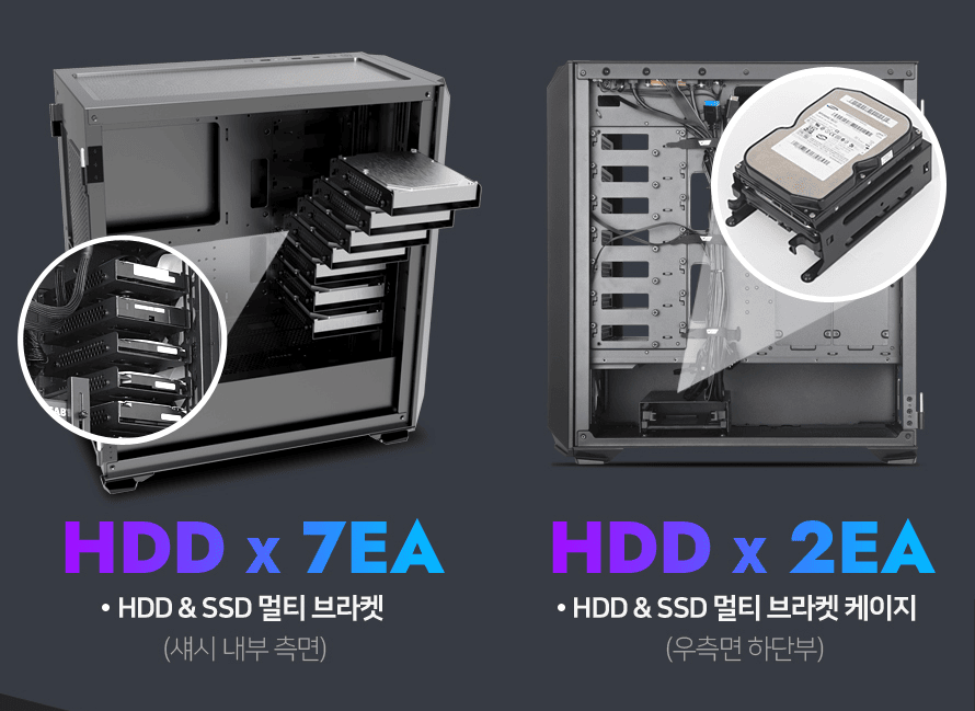 그리고 마지막으로 HDD 하드 장착할 수 있는 베이가 2개밖에 없다는 것입니다.