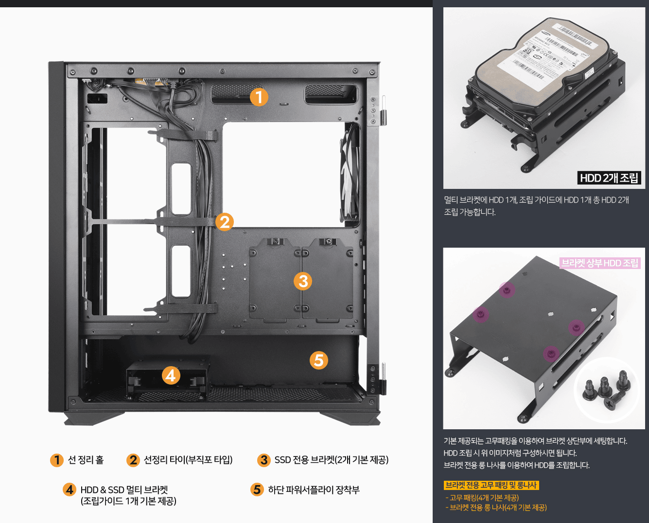 매우 튼튼한 케이스임에 불구하고, 조립에 특장점을 극대화하면서, 디자인까지 신경 쓴 케이스라서 고가임에 불구하고도 인기가 많은 제품인 것 같습니다. 정말 선정리가 가능한 홀들이 너무 많고 편리합니다.