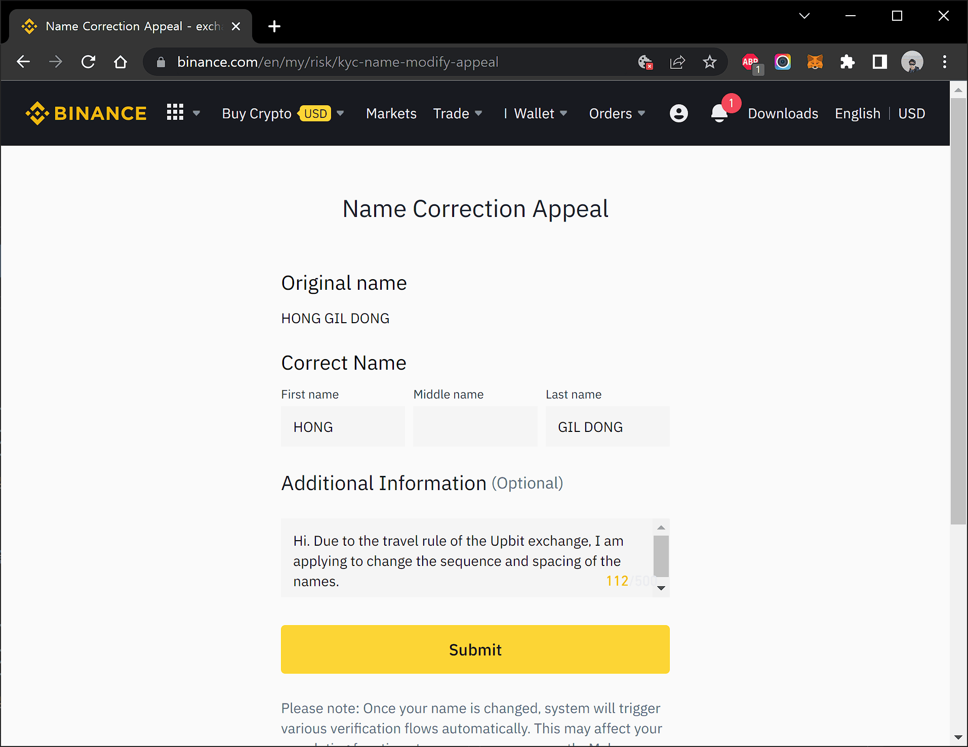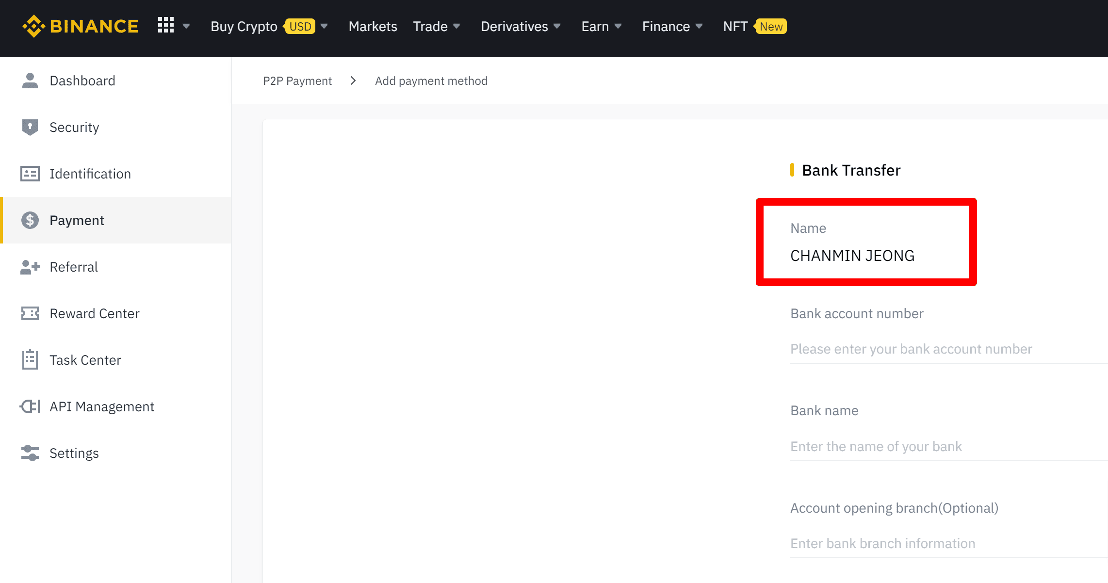 이렇게 성과 이름을 반대로 적는 이유는, 표기 순서 때문입니다. 만약 정상적으로 적으면 GIL DONG HONG으로 표기가 되기 때문이죠. "길동 홍, 찬호 박"처럼요. (현재는 띄어쓰기, 대소문자, 순서를 맞춰야지만, 추가 인증 시스템 없이 통과가 됩니다. 바이낸스 이름이 아예 한국 이름(Frist 또는 Last한쪽에만)으로 적혀있어도 됩니다. 추후에 인증시스템에 개선이 생겨서 영어 이름 표기 순서도 상관없이 통과될 수도 있습니다.)