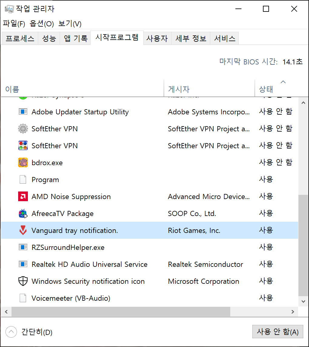 기존에 Riot Vanguard 설치를 했더라도, 시작프로그램에서 사용 및 사용안함 유무와 관계없이 업데이트가 되지 않는 현상이 있습니다.