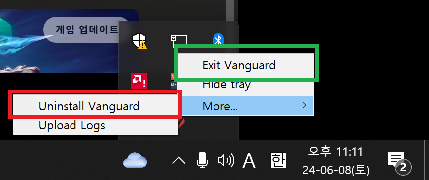 작업표시줄 실행되고 있는 트레이 화면의 Vanguard 를 마우스 우클릭 한다음 More... 에 있는